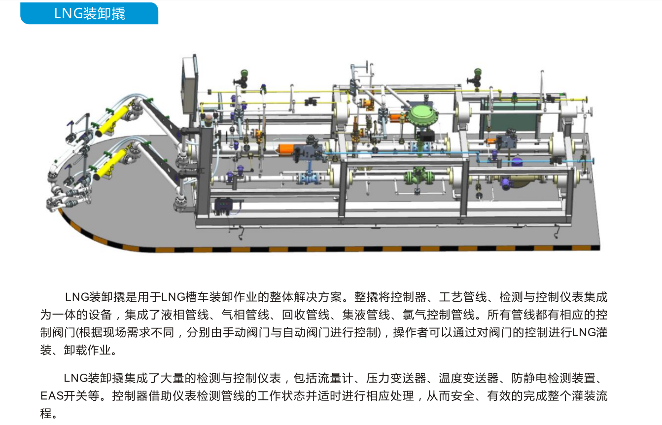 LNG 裝卸系統(tǒng)是放置到一個(gè)裝卸車臺(tái)上的一個(gè)或多個(gè)利用LNG卸車臂、工藝過程管線和閥門、測(cè)量?jī)x表、控制閥、環(huán)境氣化器卸裝LNG產(chǎn)品和通過工藝過程管線和閥門、測(cè)量?jī)x表、批量控制器、控制閥、LNG裝車臂將LNG定量裝入槽車,或從槽車卸載LNG的成橇系統(tǒng)。